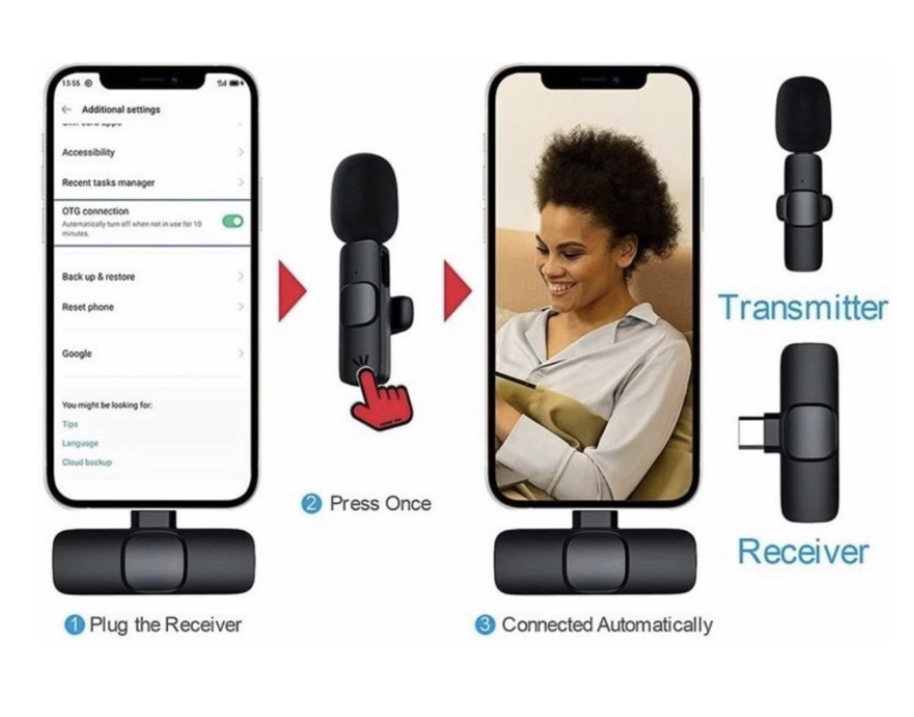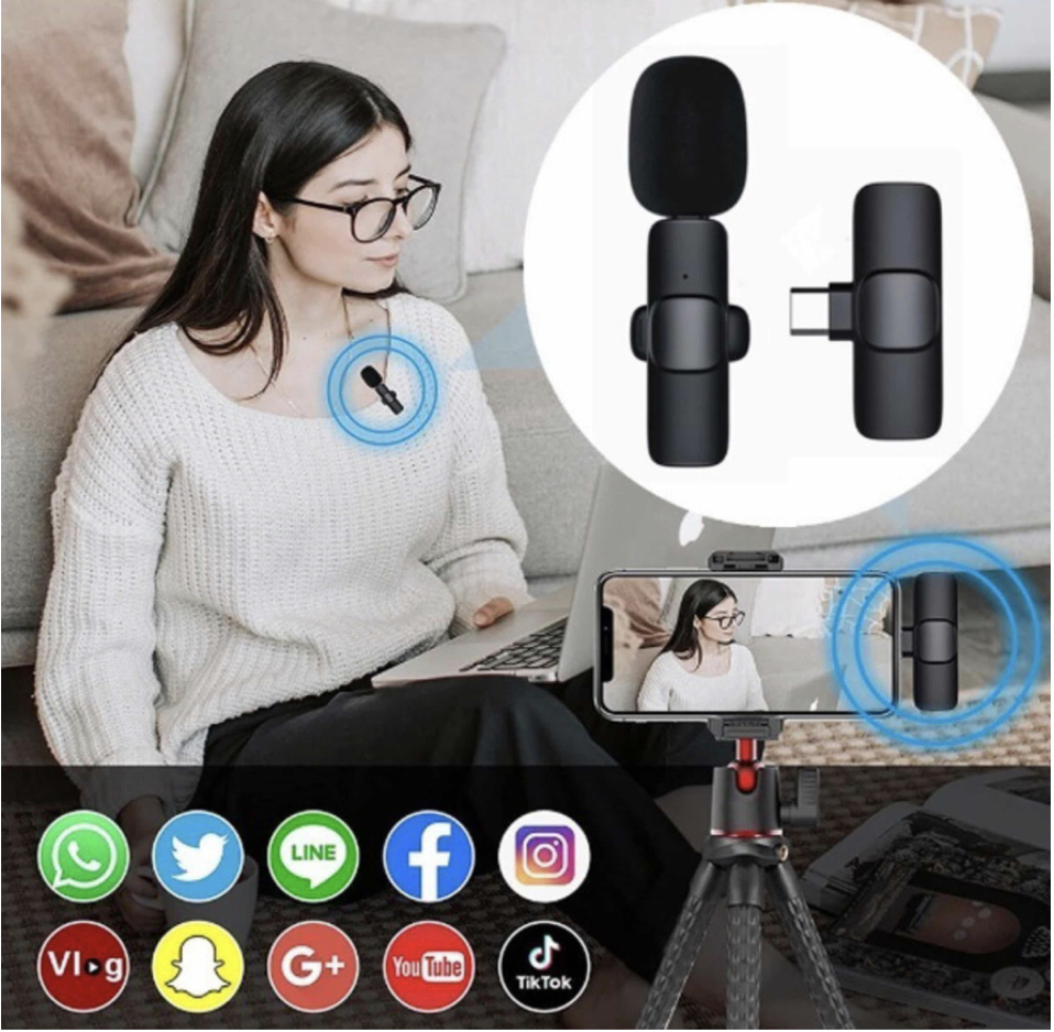Microfono inalámbrico para Iphone Y tipo C recargable que incluye transmisor y receptor que se conectan sin necesidad de aplicación o Bluetooth! características: Práctico y fácil de transportar. Puede transmitir en vivo en cualquier momento, en cualquier lugar, sin límites. Compatible con IOS y Android sistema de cámara, Tablet, PC, Cualquier dispositivo con puerto tipo C y compatible con OTG puede usarlo. Conexión de 2,4 GHz en segundos Plug and play, sin retraso. No es necesario descargar ninguna aplicación, fácil de operar. Retraso de tiempo inferior a 16,5 ms, sincroniza el sonido en tiempo real. Reducción de ruido profesional, concéntrese en su propia voz. Sonido original sin pérdidas, experimenta el sonido original real.20m de alcance aceptable, accesible y sin restricciones. Tipo de micrófono: condensador Tamaño: 6.3 x 2,2 x 1.5 Cm Material:ABS Color: Negro